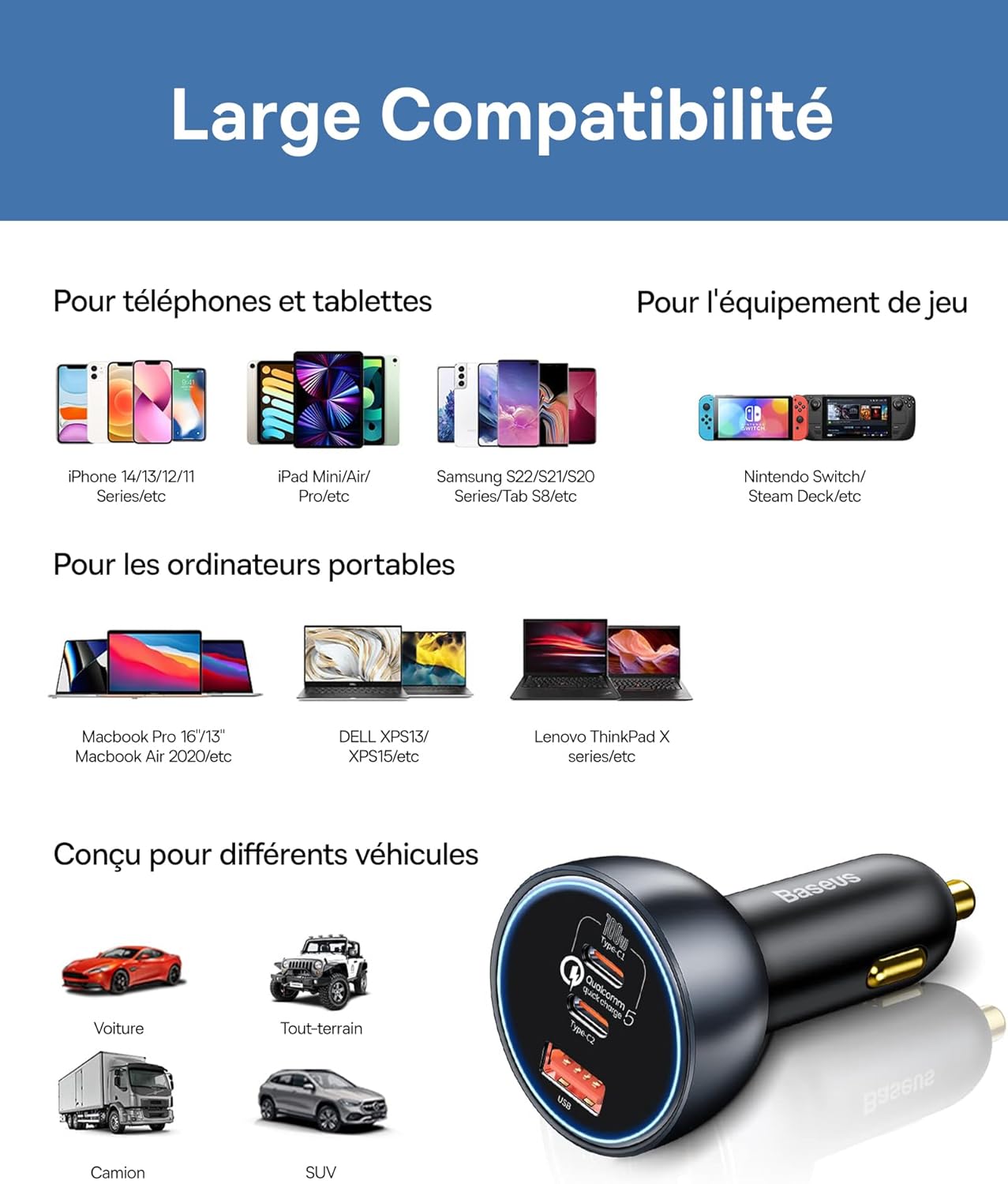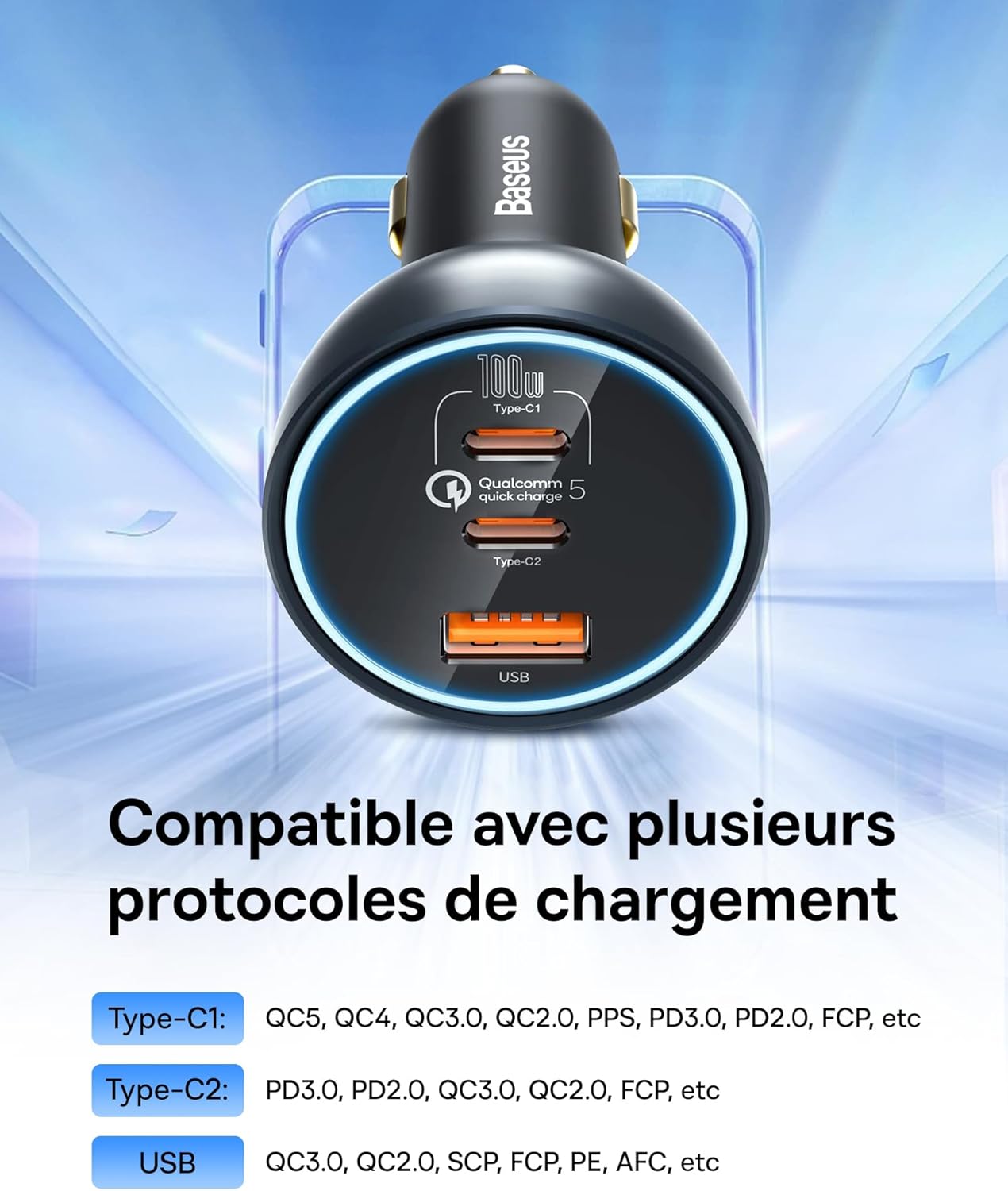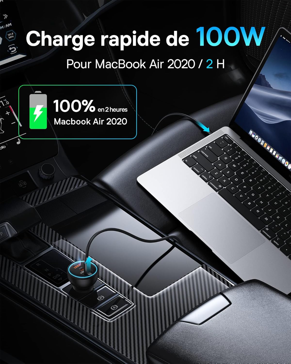 L’Ordre dans la Voiture : Chargeur avec câbles rétractables intégrés (Lightning, USB-C, Micro-USB) pour une voiture toujours rangée. Recharge rapide de tous les appareils.